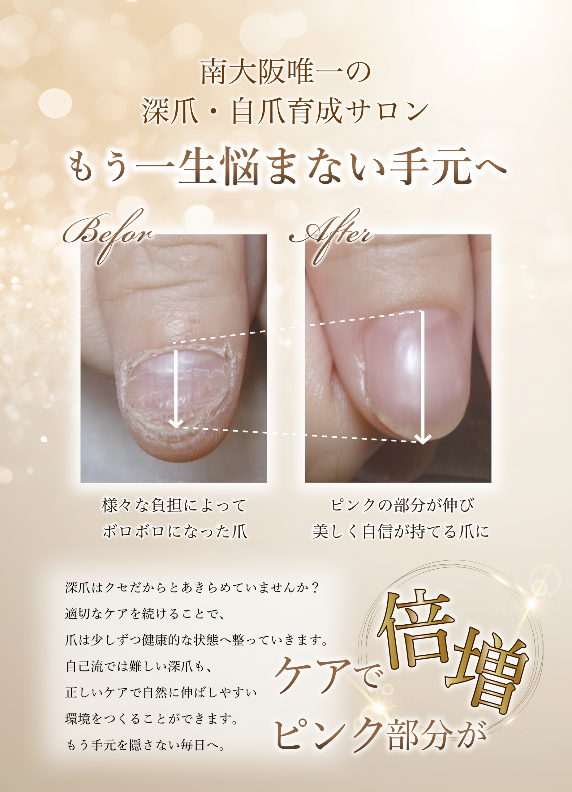 指先のコンプレックスから少しずつ解放され、すっきりとした美しい自爪を目指せます。 -