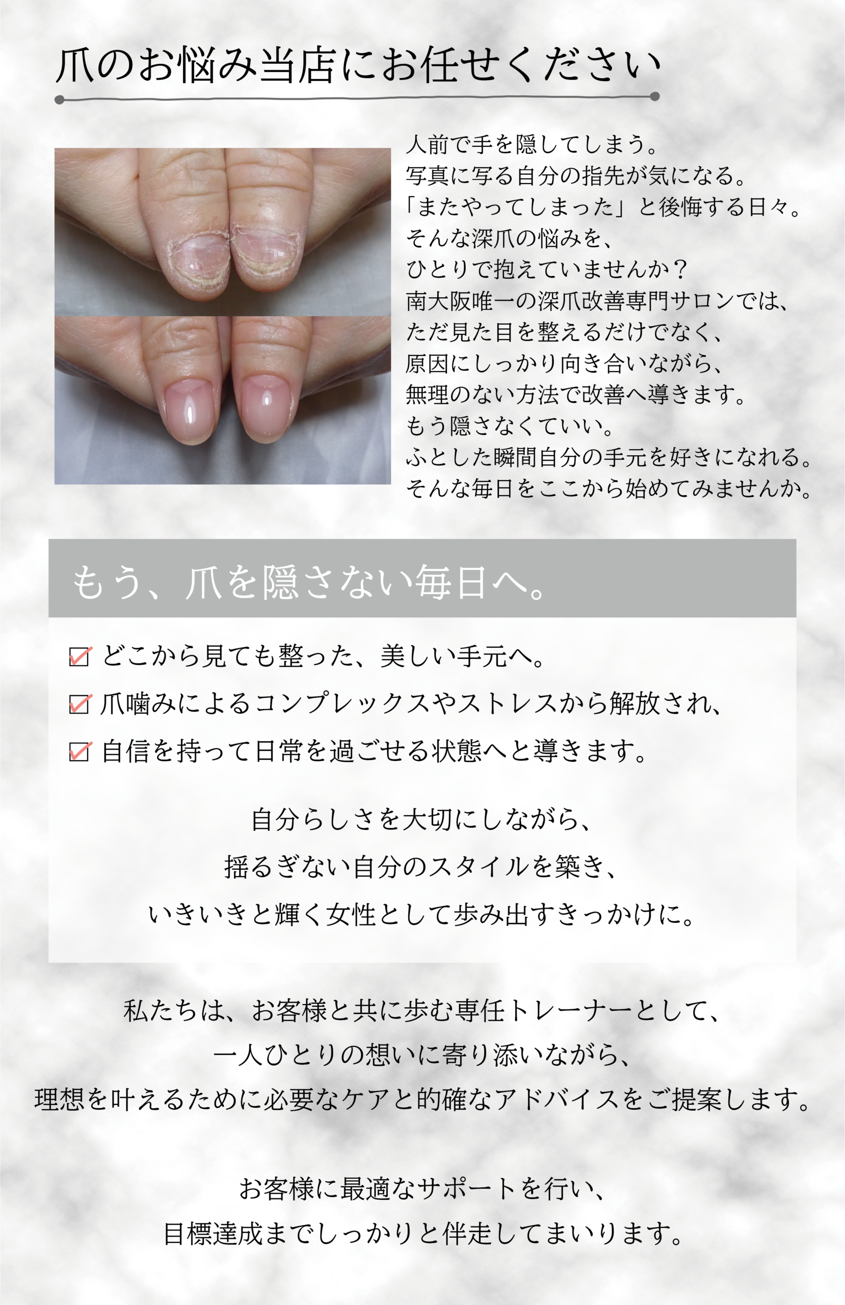 お客様の不安やつらさに寄り添いながら、理想の指先へ導ける自信があります。